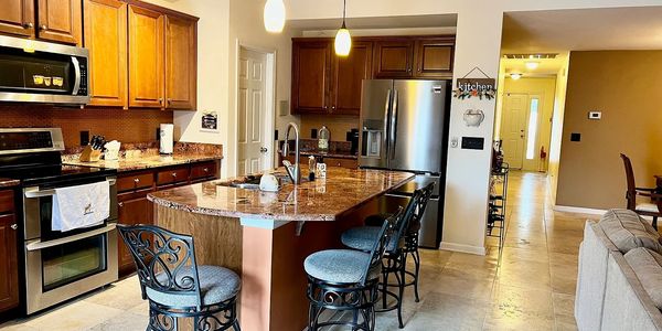 Three bed, 2 bath top floor condo with vaulted ceilings.